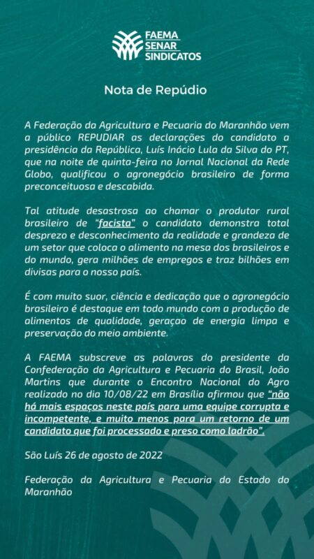 O Sistema Faema/Senar, formado pela Federação da Agricultura do Maranhão e Serviço Nacional de Aprendizagem Rural, em nota divulgada sexta-feira (26) repudiou a fala do ex-presidente Lula, que em entrevista ao Jornal Nacional da última quinta-feira (25) tratou os empresários do agronegócio de maneira preconceituosa. Lula disse que os agropecuaristas são a favor do desmatamento e ideologicamente têm comportamento fascista.