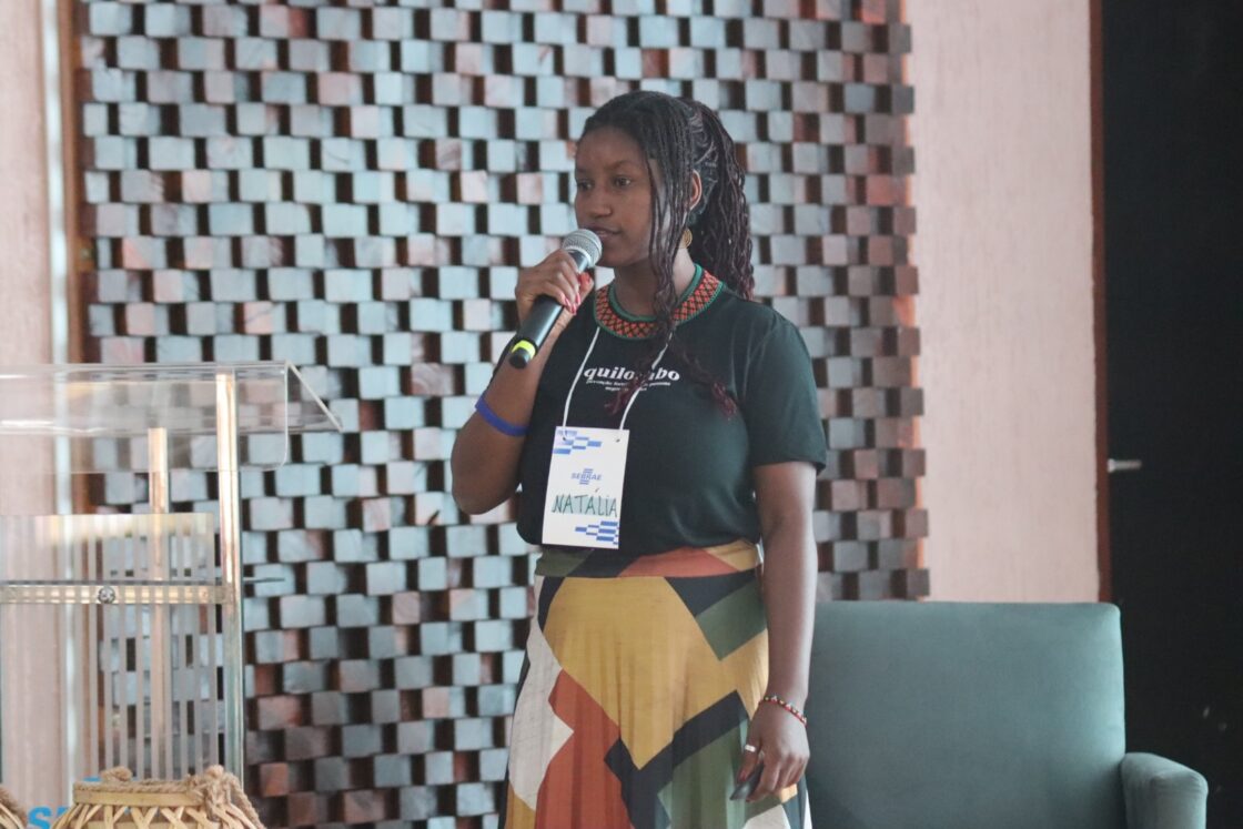 Dominga Natália Moreira, representante da comunidade Kalunga, em Cavalcante (GO), destacou o trabalho com turismo de base comunitária, mostrando como o território quilombola tem estruturado atividades de visitação integradas à cultura local.