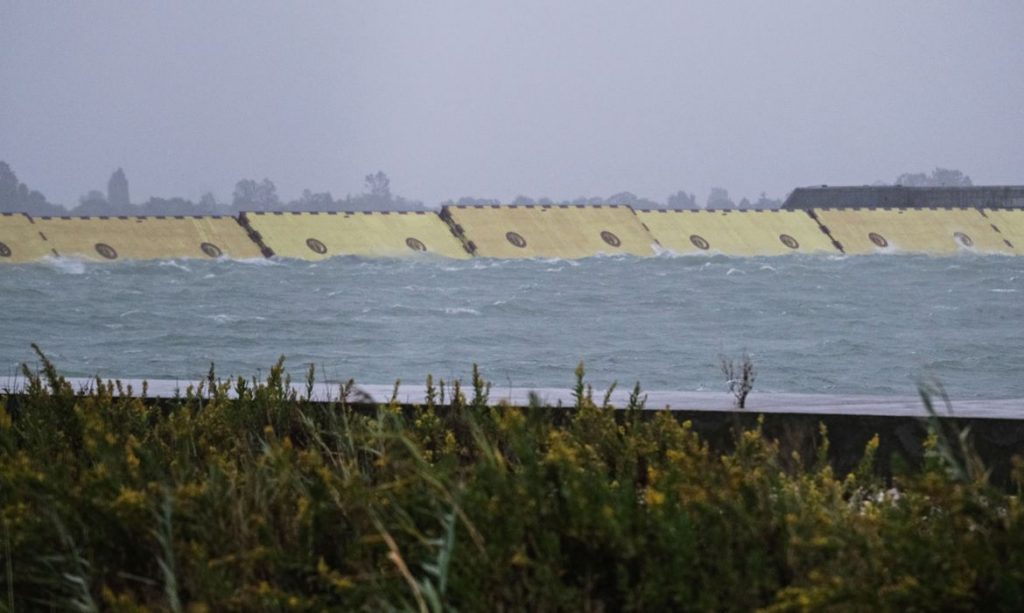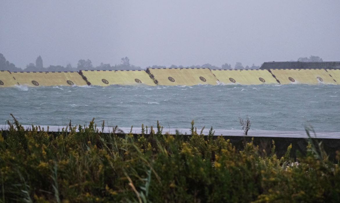 A rede de 78 barreiras amarelas que guardam a entrada da lagoa veneziana se ergueu do fundo do mar quando a maré, impulsionada por fortes ventos e chuva, começou a subir.