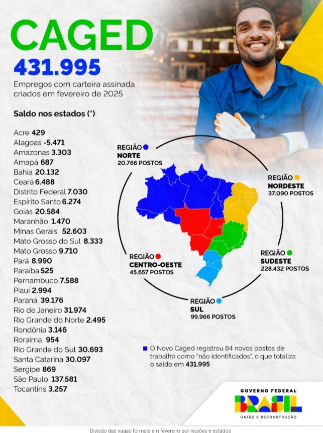 Nacional — O Brasil gerou 431,9 mil postos de trabalho com carteira assinada em fevereiro. É o número mais expressivo para o mês da série histórica do Novo Caged. O resultado é superior às 307 mil vagas de fevereiro de 2024, às 252 mil registradas no mesmo mês em 2023, às 353 mil de 2022, às 397 mil de 2021 e às 217 mil de 2020.
