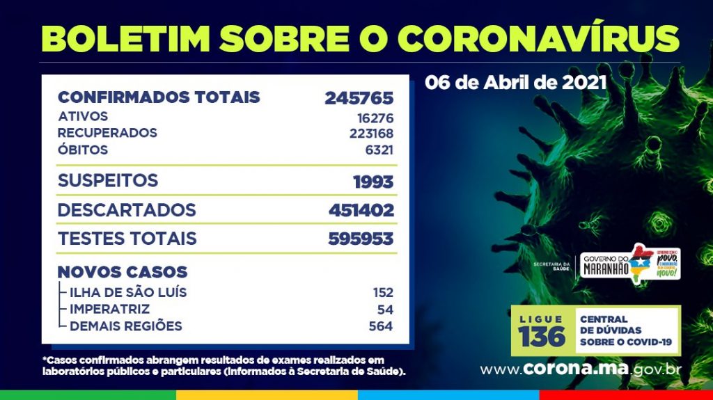 Com o registro de mais 43 casos de vítimas fatais, o Maranhão chegou nesta terça-feira (06) a mais de 6,3 mil mortes por covid-19, conforme previu Maranhão Hoje. De acordo com o boletim da Secretaria Estadual da Saúde (SES), mais de 670 novos casos foram testados positivamente nas últimas 24 horas, e agora são mais de 245 mil pessoas já infectadas no estado.