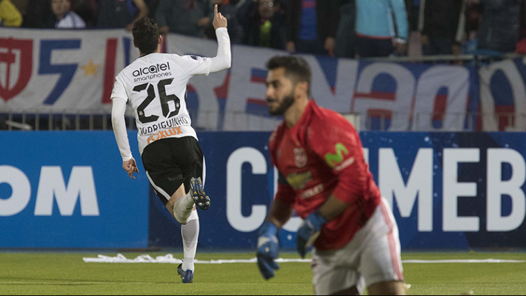Contra-ataque – Mesmo com a boa vantagem criada na partida de ida, o Timão não se contentava em apenas se defender e saia bastante para o setor ofensivo – sobretudo no contra-ataque. Aos 36 minutos, Cássio lançou a bola para o ataque e Rodriguinho fez um excelente domínio. O camisa 26 carregou, limpou de dois zagueiros e bateu forte para abrir o placar no Estádio Nacional, no Chile. Foi o oitavo gol dele no ano – todos anotados em partidas de mata-mata – e o segundo na Conmebol Sul-Americana. Rodriguinho é o artilheiro alvinegro em 2017.