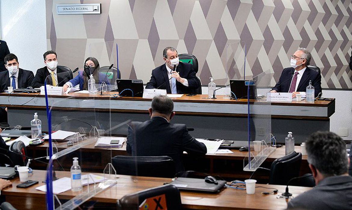Comissão Parlamentar de Inquérito da Pandemia (CPIPANDEMIA) realiza oitiva da diretora técnica da Precisa Medicamentos, empresa que representa a Bharat Biotech no Brasil e que teria feito intermediação nas negociações para compra da vacina Covaxin. O depoimento da diretora-executiva à CPI da Pandemia foi adiado para hoje (14) após a depoente afirmar estar “exausta” e sem condições psicológicas de falar à comissão na noite desta terça-feira (13). A depoente ainda está suportada por um habeas corpus que lhe dá o direito de silenciar sobre perguntas que possam incriminá-la. Mesa: advogado da depoente, Pedro Ivo Velloso; advogado da depoente, Ticiano Figueiredo; diretora técnica da Precisa Medicamentos, Emanuela Batista de Souza Medrades; presidente da CPIPANDEMIA, senador Omar Aziz (PSD-AM); relator da CPIPANDEMIA, senador Renan Calheiros (MDB-AL). Foto: Pedro França/Agência Senado