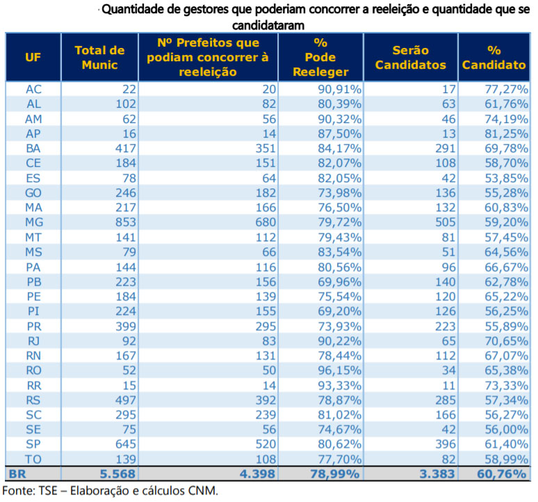 Segundo a CNN, dos 5.568 municípios brasileiros que escolherão prefeitos nas eleições deste ano, em 3.383 (61% do total) os atuais gestores concorrerão à reeleição. Outros 1.015 prefeitos poderiam concorrer por estar no primeiro mandato, mas desistiram de tentar um novo mandato. Os dados fazem parte de levantamento feito pela Confederação Nacional dos Municípios (CNM).