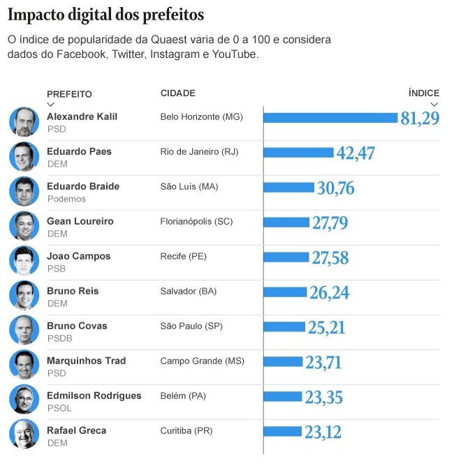 O prefeito de São Luís aparece à frente de chefes de grandes cidades, como Rafael Greca, de Curitiba (10ª colocação); de Bruno Covas, de São Paulo (7ª colocação); além de Bruno Reis, Salvador (6ª colocação); de João Campos, Recife (5ª colocação); e de Gean Loureiro, Florianópolis (4ª colocação). Braide está no topo do ranking ao lado de Alexandre Kalil (Belo Horizonte) e Eduardo Paes (Rio de Janeiro).
