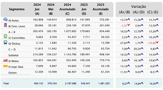 De acordo com a entidade, em junho os emplacamentos de veículos (soma dos segmentos automotores) aumentaram 6,3% em relação a maio. O crescimento ocorreu mesmo com menor número de dias úteis em relação ao mês anterior (vinte dias em junho, ante 21 em maio), o que demonstra o aquecimento do mercado.