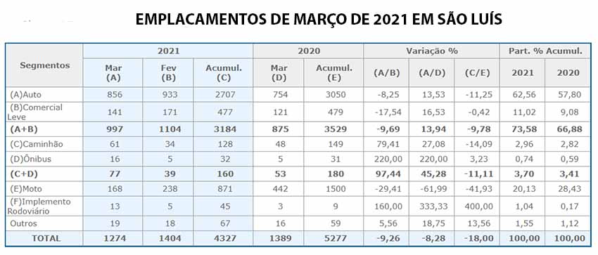 De acordo com os dados da Fenabrave, o segmento de automóveis e comerciais leves registrou 2.180 contra 2.359 de fevereiro (queda de 7,59%). O segmento de veículos pesados (ônibus e caminhões) registrou 164 emplacamentos contra 107, um aumento de 53,27%. Já o segmento de motocicletas teve 1.470 emplacamentos contra 2.077, ou seja, um desempenho negativo de 56,15%.