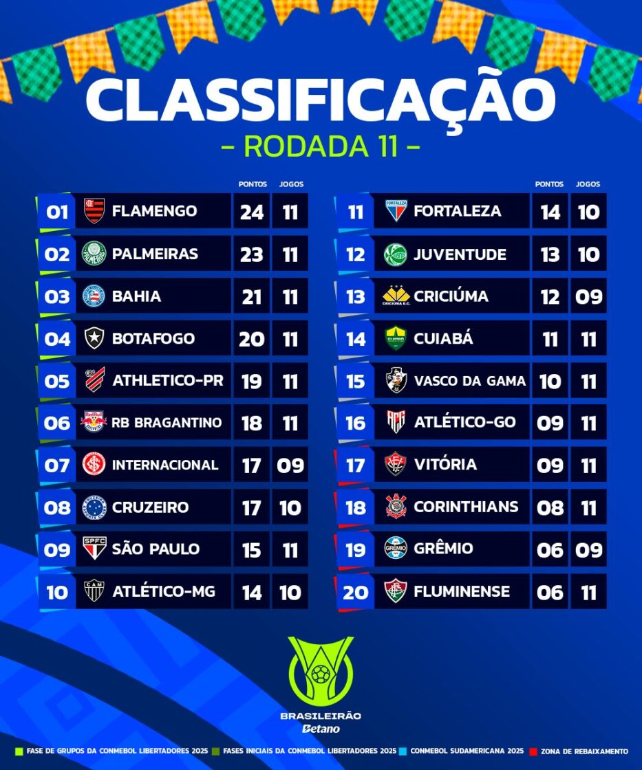 Vice-liderança – O Palmeiras continua na perseguição ao líder Flamengo. O time alviverde derrotou o Juventude por 3 a 1, no Allianz Parque, e agora é vice-lider. Ainda pela 11ª rodada, o Red Bull Bragantino derrotou o Vitória por 2 a 1, enquanto o Corinthians empatou com o Athletico Paranaense por 1 a 1, o Fortaleza também empatou com o Atlético Mineiro em 1 a 1 e o Bahia goleou o Cruzeiro por 4 a 1.