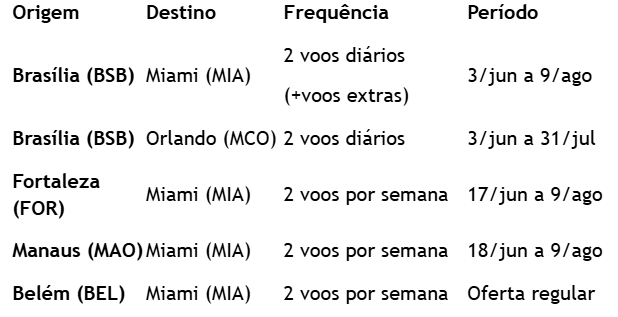 • Brasília (BSB)-Miami (MIA): Além das operações regulares, a GOL ofertará 1 novo voo diário (totalizando 2 decolagens todos os dias), mais 1 voo extra às terças e sábados (totalizando 3 voos nesses dois dias da semana), de 3 de junho a 9 de agosto.