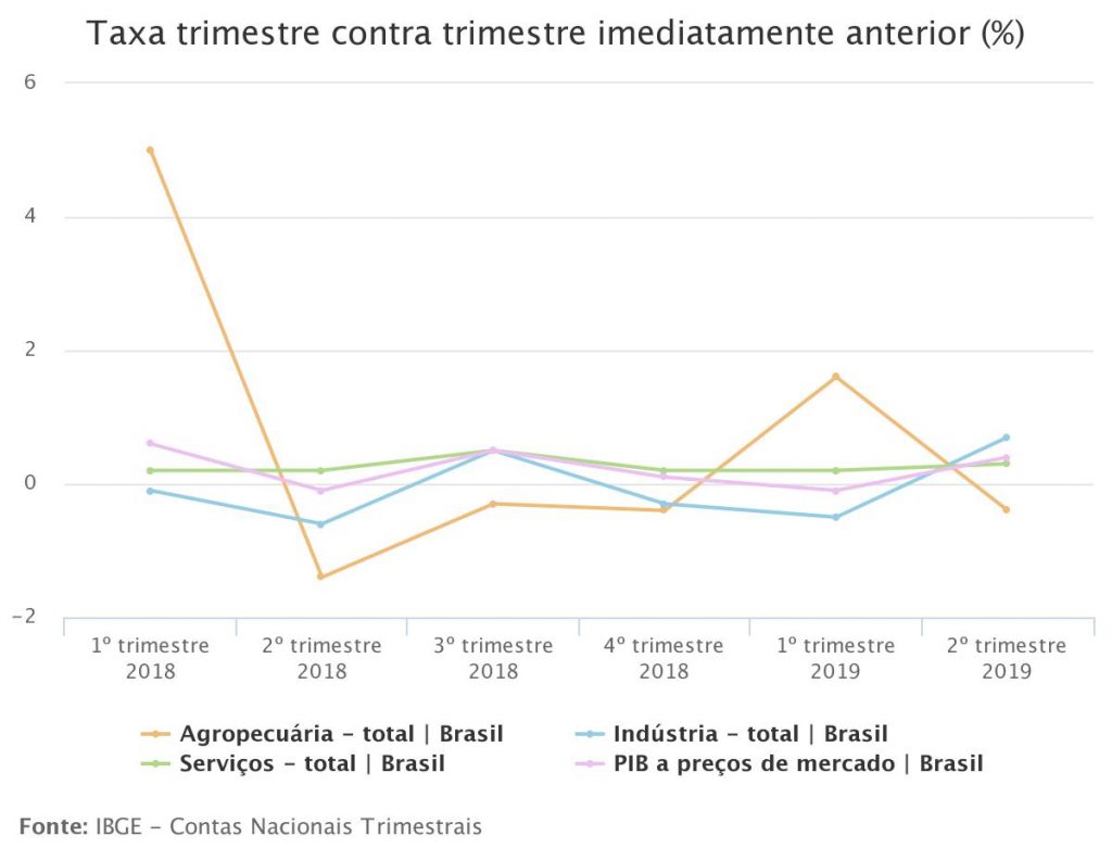 O Produto Interno Bruto (PIB) nacional cresceu 0,4% no segundo trimestre de 2019, frente ao trimestre anterior. O resultado foi puxado, principalmente, pelos ganhos da indústria (0,7%) e dos serviços (0,3%). Já a agropecuária caiu 0,4%. Na comparação com o 2º trimestre de 2018, o aumento foi de 1,0%. As informações, que fazem parte do Sistema de Contas Nacionais Trimestrais, foram divulgadas hoje pelo IBGE.
