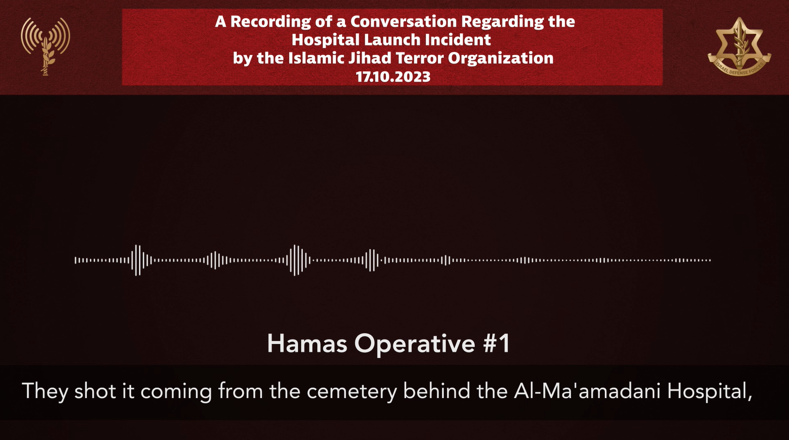 Uma das provas apresentadas pelos militares israelenses foi uma conversa interceptada entre dois integrantes do Hamas, publicada posteriormente na conta oficial do Ministério de Relações Exteriores de Israel no X (antigo Twitter). Esses dois oficiais revelam que a falha aconteceu, e que os mísseis foram lançados a partir de um cemitério que fica atrás do hospital atingido, em Gaza.