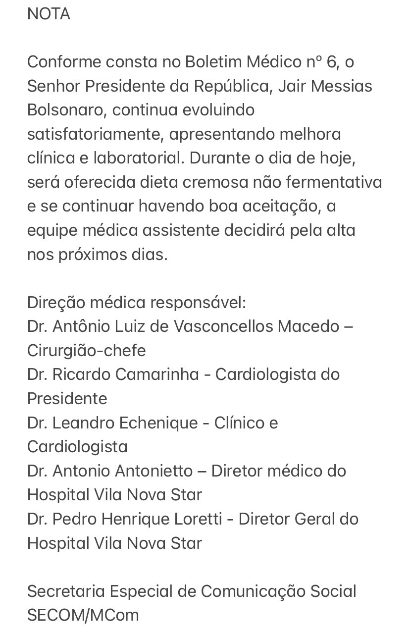 “O sistema digestivo já está funcionando”, disse o médico. Macedo acrescenta que o presidente pode retomar as atividades “com calma” a partir de segunda-feira (19).