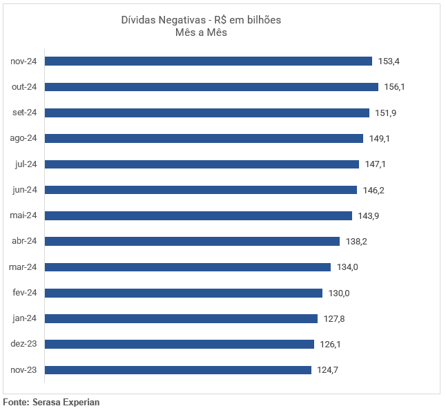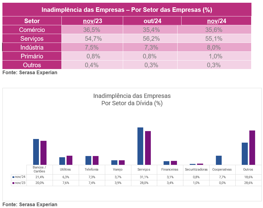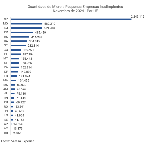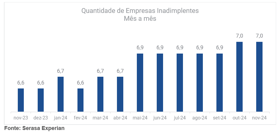 No cenário nacional, em novembro, 7,0 milhões de negócios estavam com contas negativadas no país, representando 31,9% do total de companhias existentes, conforme o Indicador de Inadimplência das Empresas da Serasa Experian, primeira e maior datatech do Brasil.
