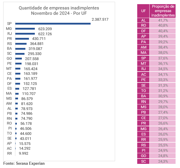Em novembro, a análise das Unidades Federativas revelou que Alagoas registrou a maior taxa de inadimplência das empresas do país, com 41,7% das companhias do estado com o CNPJ no vermelho. O ranking continuou com Roraima (40,8%) e Distrito Federal (40,4%) destacando-se como as regiões com mais pendências financeiras entre os negócios.