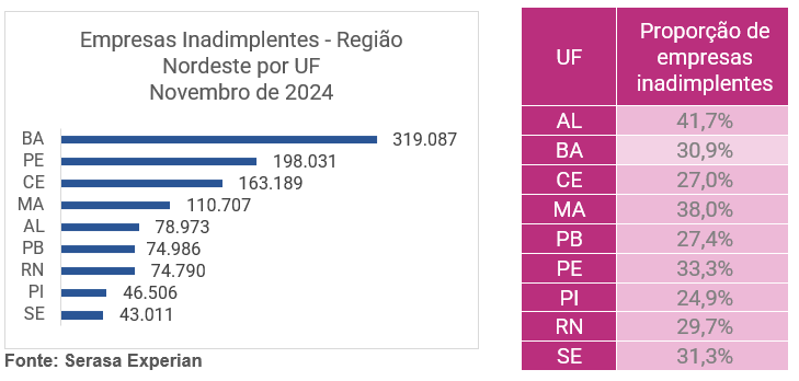 De acordo com o Indicador de Inadimplência das Empresas da Serasa Experian, primeira e maior datatech do Brasil, em novembro no Nordeste do país, o endividamento atingiu 110.710 empreendimentos, equivalente a 38% das companhias existentes no estado, o segundo maior índice proporcional da região, atrás apenas em Alagoas, onde foram 78.973, ou seja, 41,7%. Sergipe foi o estado nordestino que registrou o menor número de empresas inadimplentes 943.011).