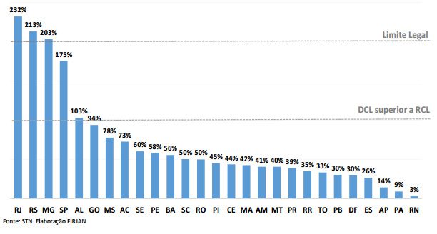 No que diz respeito ao endividamento do Estado, o estudo da federação fluminense indica que 42% da receita são comprometidos para pagamento, o que deixa o estado na 16ª posição. Para que se tenha ideia, o Rio de Janeiro tem um dívida correspondente a mais 232% da sua receita.
