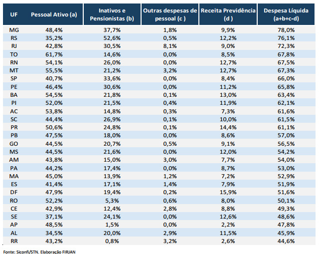 De acordo com a Firjan, os elevados gastos com pessoal associado à queda nas receitas têm gerado um desequilíbrio fiscal entre os estados. O documento ressalta que o principal problema dos governos estaduais é o elevado comprometimento do orçamento com gastos com pessoal, especialmente por conta do grande desequilíbrio previdenciário.