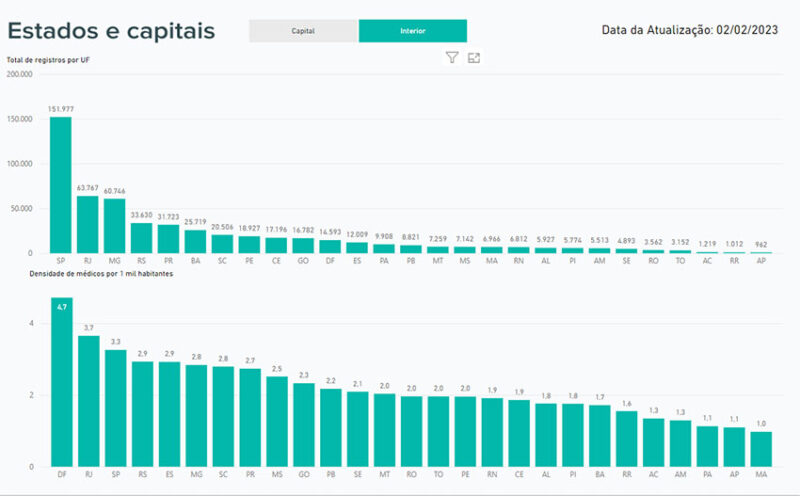 A proposta é democratizar o acesso a informações sobre o perfil de médicos no Brasil. Com poucos cliques, é possível saber quantos profissionais em atividade há no país, incluindo recortes por estado, por capital e no interior de cada unidade federativa, além da proporção de médicos por habitante.