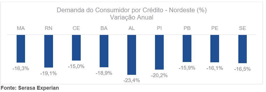 Em fevereiro, no Nordeste do país, o estado de Alagoas registrou a maior queda na busca dos consumidores por crédito, com diminuição de 23,4% em relação ao mesmo mês do ano anterior. Em seguida estava o Piauí, que caiu 20,2%.