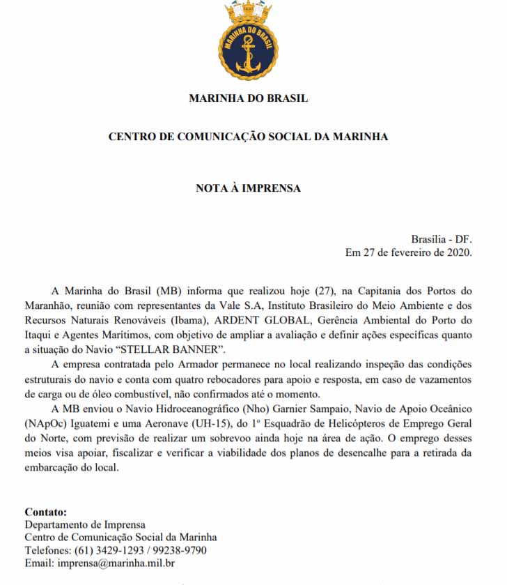 Em nota expedida na noite desta quinta-feira (27), a Marinha do Brasil informou que está acompanhando estudos que visam a desencalhar o navio coreano Stellar Banner, que está encalhado num banco de areia, na Baía de São Marcos. O ibama também se manifestou sobre o caso e ameaça multar a empresa responsável pela embarcação pelos danos ambientais que vierem a ocorrer.