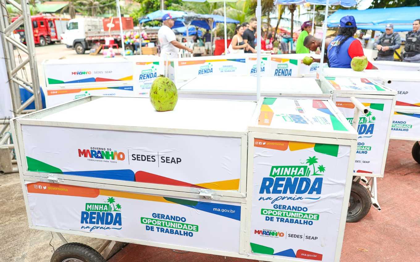 Minha Renda Praia – Como parte das políticas de inclusão sócioprodutiva do Governo do Maranhão, o governador Carlos Brandão também entregou 25 novos carrinhos do programa Minha Renda Praia para vendedores que atuam na região do Araçagy. Foram entregues 10 carrinhos para a venda de milho, 3 para churrasco e 15 para coco.
