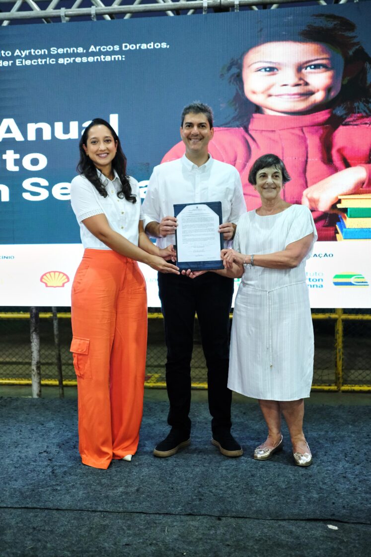 A secretária de educação de São Luis, Caroline Marques Salgado, o prefeito, Eduardo Braide e a diretora de educação do Instituto Ayrton Senna, Inês Kisil Miskalo (Divulgação Instituto Ayrton Senna)