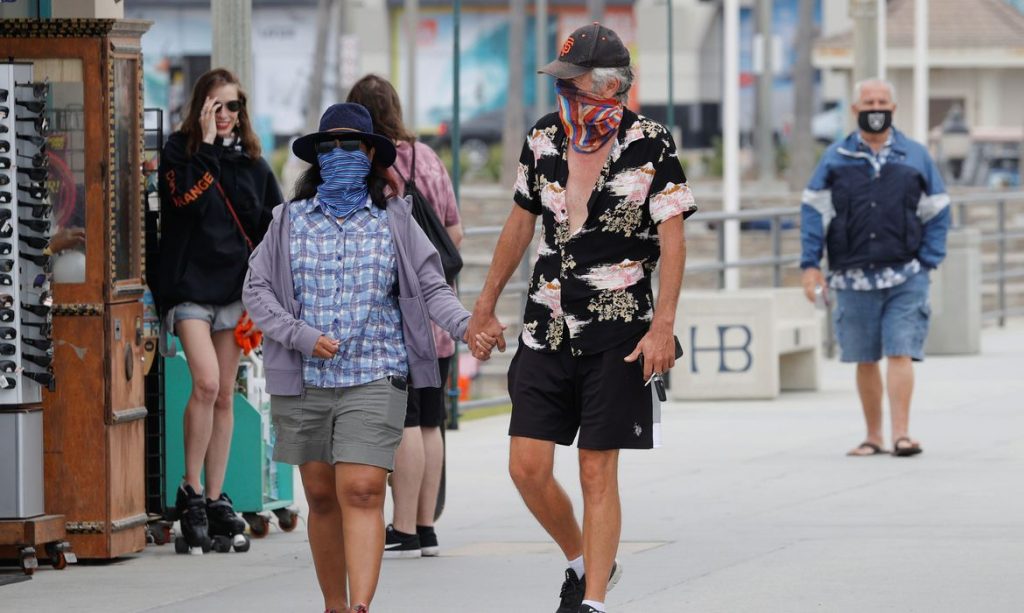Pessoas que usam máscaras caminham ao longo do cais do oceano enquanto os Estados Unidos passaram na quinta-feira um total de mais de 4 milhões de infecções por coronavírus durante o surto global da doença por coronavírus (COVID-19) em Huntington Beach, Califórnia, EUA, em 23 de julho de 2020 REUTERS / Mike Blake