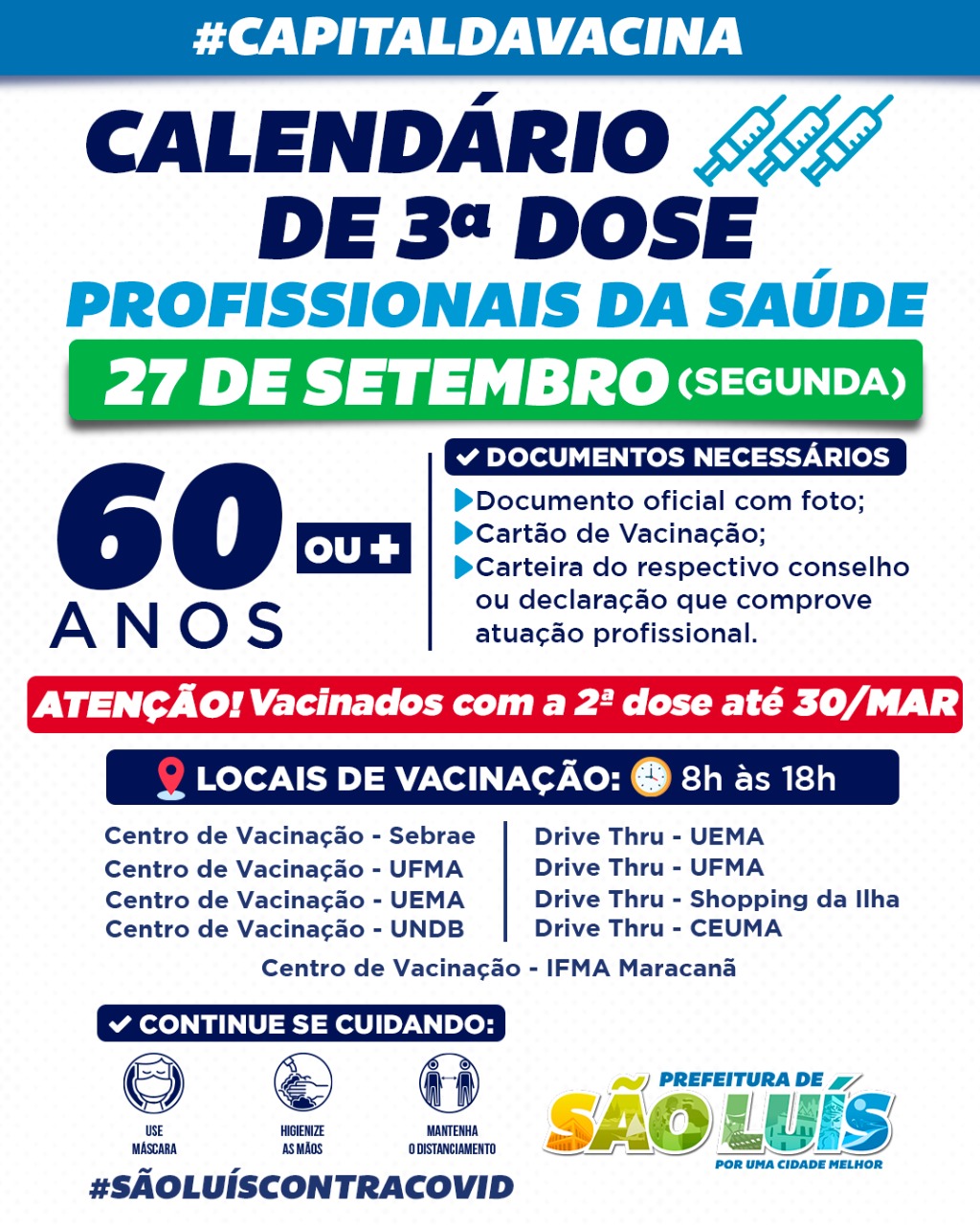 Este público poderá ir a qualquer um dos nove pontos de vacinação da Prefeitura, instalados nos centros municipais de vacinação do Multicenter Sebrae, Universidade Federal do Maranhão (UFMA), Universidade Estadual do Maranhão (UEMA), Instituto Federal de Educação, Ciência e Tecnologia do Maranhão (IFMA) Maracanã e Drive-thru do Ceuma, Ufma e Shopping da Ilha, que funcionam das 8h às 18h, levando documento de identificação com foto e o cartão de vacina.