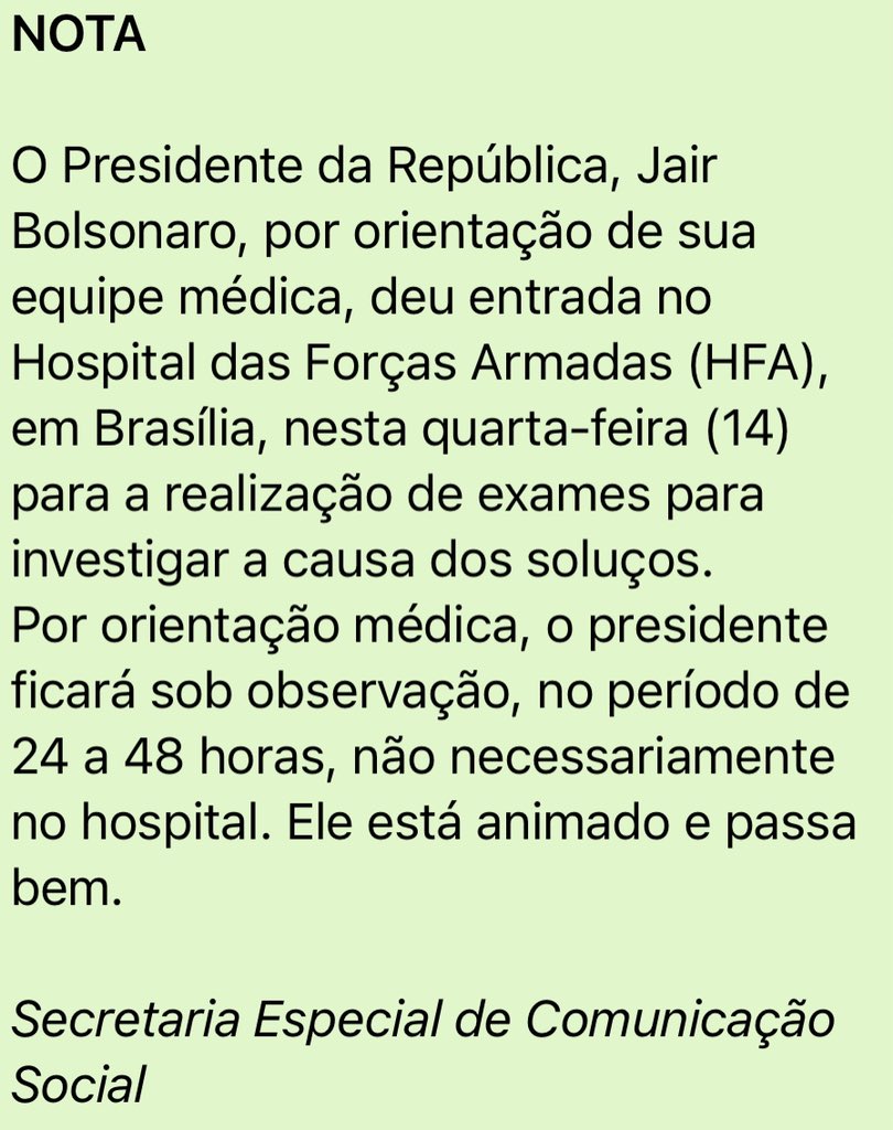 O ministro Fabio Faria, da Secretaria de Comunicação Social (Secom) da Presidência da República, emitiu nota sobre a saúde do presidente Jair Bolsonaro (sem partido), que deu entrada nesta quarta-feira (14) no Hospital das Forças Armadas. De acordo com a nota, “ele está animado e passa bem”.