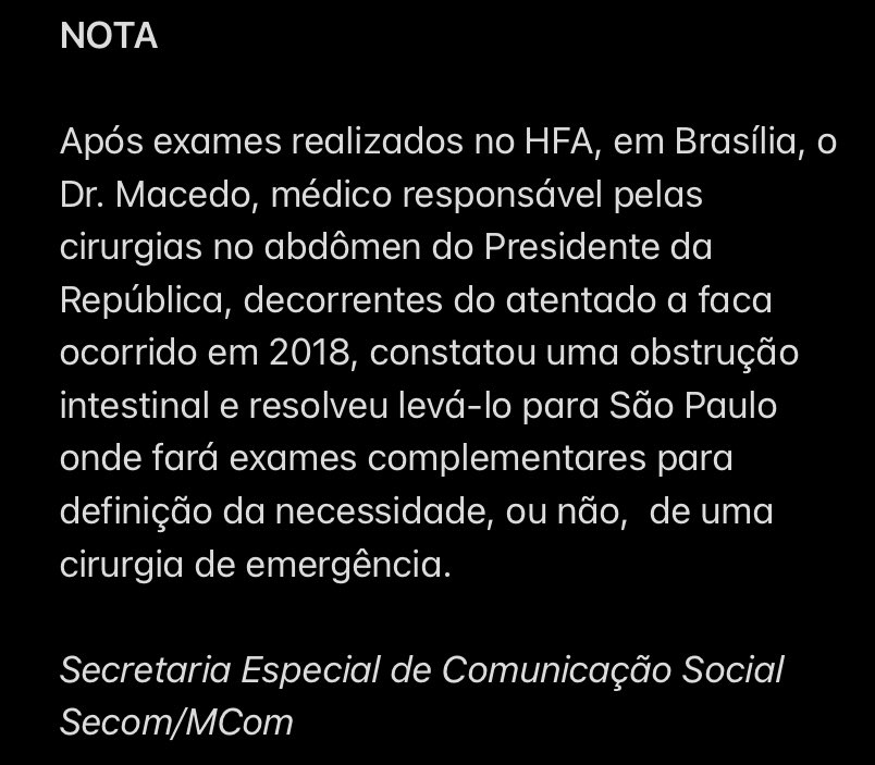 De acordo com a nota,  a transferência se deve à necessidade de um exame mais minucioso para definir a necessidade oh não de uma nova cirurgia na região intestinal afetada pela facada no atentado de setembro de 2018.