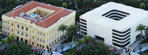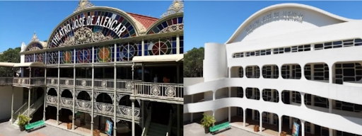 Projetado por José de Castro Fialho, o Teatro José de Alencar é reconhecido pela fachada em ferro trabalhado, colorida e rica em detalhes decorativos. Na versão criada pela IA com o traço niemeyeriano, o espírito artístico do edifício é mantido, mas os ornamentos são reduzidos. O ferro detalhado se converte em curvas amplas e em um volume contínuo, que preserva a vocação cultural do teatro, agora reinterpretada sob uma estética mais leve e moderna.