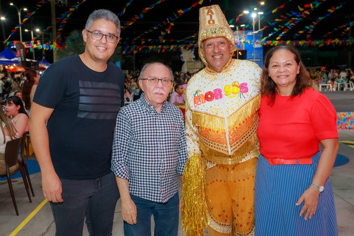 O presidente da Federação do Comércio, Maurício Feijó, com o superintendente da entidade, Max Medeiros, o amo do Boi de Morros, Lobato, e a diretora do Sesc-MA, Rutneia Monteiro