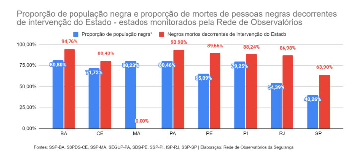 Rio de Janeiro e São Paulo também chamam a atenção pela alta letalidade de pessoas negras por agentes de segurança. No Rio de Janeiro, 54,39% da população é negra, mas o número de óbitos representa 86,98%. Em São Paulo, cuja população inclui 40,26% de negros, as mortes destas pessoas por policiais somam 63,90% do total.