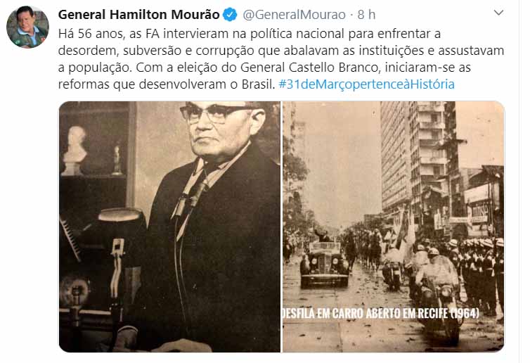 Em sua conta no Twitter, Hamilton Mourão publicou uma mensagem para afirmar que há 56 anos as Forças Armadas “intervieram na política nacional para enfrentar a desordem, subversão e corrupção que abalavam as instituições e assustavam a população”. Fernando Azevedo e Silva divulgou nesta segunda-feira (30) uma nota para lembrar o aniversário do golpe militar e defendeu que o “movimento” foi um “marco para a democracia brasileira” e uma reação “às ameaças que se formavam àquela época”.