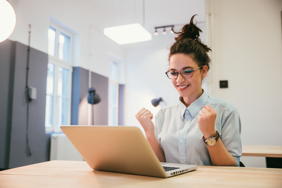 Gril passing an exam, euphoric girl watching a laptop in the library